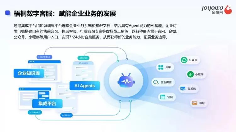 二是梧桐数字客服, 聚焦于企业业务能力的延伸。在AI Agents底座上,通过连接企业知识库,CRM、ERP等业务系统,以及提供的全渠道连接客户的通道,创建售前咨询、售后客服、咨询专家等角色,从而帮助企业打造自助获客、自助服务、自助营销的能力,为企业的业务注入新的生产力。