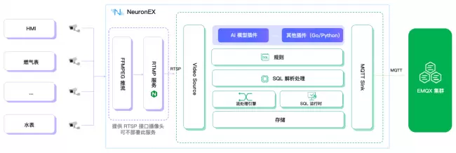 该方案使用 NeuronEX 提供的边缘计算组件,通过将视频流抽帧的方式接入图像数据。NeuronEX 通过集成智擎信息基于边缘端的图像识别算法,实现对图像识别算法函数的调用,实现对表计数据的读取: