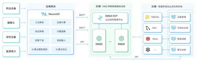 机场能源管理范围广泛且复杂,除了基础的设备接入功能,还需集中管理大量分散部署的边缘网关设备。EMQX ECP 提供了对边缘网关的统一集中配置及管理服务,实现数百个边缘设备的云端统一管理,节约了现场管理人员成本,降低了运维难度。此外,EMQX ECP 管理平台可以与智擎信息 AI 模型训练平台深度结合,通过持续采集现场数据对 AI 模型进行优化,并把优化后的算法通过 EMQX ECP 下发到边缘侧的 NeuronEX 实现算法更新,保证模型算法的持续优化和迭代。