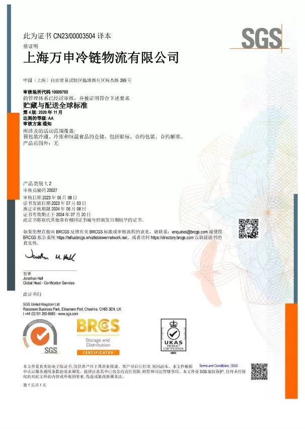 2023年,万纬物流在多个世界五百强企业客户的年度质量安全审核中获得食品安全审核第一名。万纬成为国内首家获得BRCGSS&D最高级别AA级认证的第三方冷链物流公司,也是国内首家食品行业(含食品加工企业和食品流通企业)首次申请即获得该体系AA级别认证的公司。