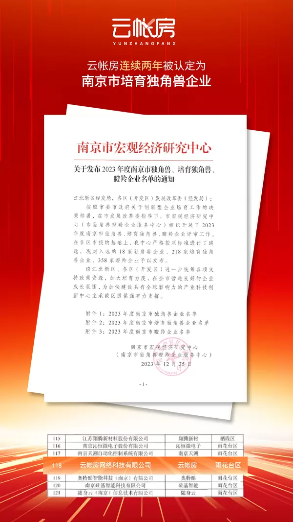 近日,南京市宏观经济研究中心发布2023年度独角兽、培育独角兽、瞪羚企业榜单。南京市共认定独角兽企业18家,培育独角兽企业218家,瞪羚企业358家。云帐房于2022年首次登录该榜单,2023年再次被评选认定为“南京市培育独角兽企业”。