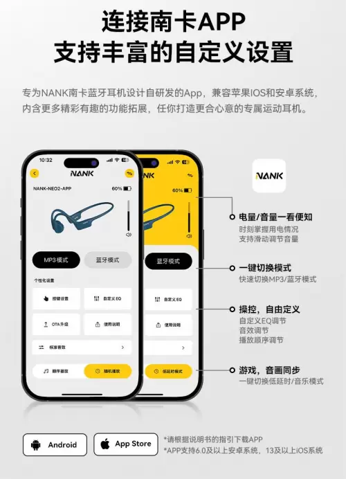 此外NANK南卡在NEO2身上可以说是下足了功夫,更植入了一项重大的设计,提供了能够连接APP的功能,并且在APP中提供了丰富的自定义设置,可以帮助用户实时查看耳机的电量等状态,并调节耳机的MP3模式、EQ音效模式及恢复出厂设置等设定。通过连接NANK南卡APP,用户不仅可以对特定功能进行深度自定义,还可以轻松更新耳机的固件版本。
