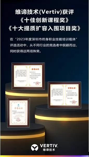 日前,深圳市人力资源与社会保障局隆重举办了“2023年度深圳市终身职业技能培训载体颁奖”活动。维谛技术(Vertiv,NYSE:VRT)凭借业内领先的专业化培训能力,获评“十佳创新课程”和“十大提质扩容入围项目”!
