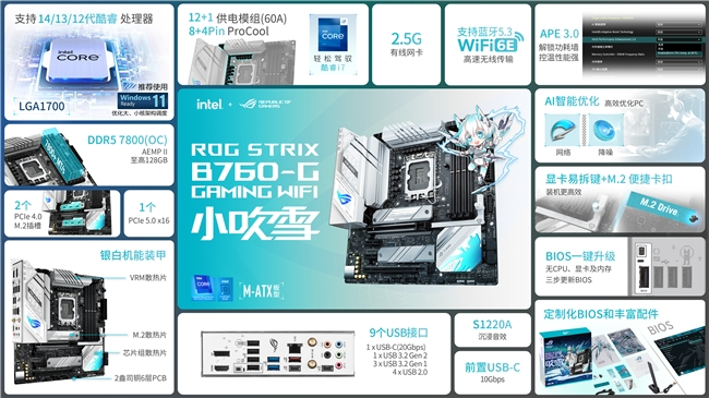 华硕Z790吹雪S新主板采用16(70A)+1(70A)+2供电模组设计,搭配双8Pin ProCool II高强度供电接口,可轻松发挥Intel酷睿14代处理器的潜力。支持DDR5 8000+(OC),不仅拥有AEMP 2.0,还特加入DIMM Flex,可智能温控优化内存,一键释放更强内存性能。支持AI智能超频、AI智能散热2.0、AI智能网络和双向AI降噪,多方位优化你的PC,令其更“聪明”。银白色一体式散热装甲加上高品质导热垫,让供电区域更加冷静,以获得更好的性能。板载5个PCIe 4.0 M.2接口,均配备高效散热片,有效降低M.2 SSD的温度,提升游戏加载速度。还有PCIe 5.0 x16高强度显卡插槽,轻松战未来。显卡易拆键,拆卸显卡一键搞定。还有M.2便捷卡扣,无需工具和固定螺丝即可轻松装卸SSD。板载2.5G有线网卡,并支持WiFi 7,可为用户带来更快、更稳定的网络环境。配备白色涂装设计的易拆式天线,可有效降低信号干扰,带来更快的无线网络和更简单的WiFi天线安装体验。板载丰富的USB接口,特别提供1个前置USB Type-C接口,不仅传输速度高达20Gbps,还支持30W PD3.0快充。支持AURA SYNC神光同步,板载3个第二代可编程ARGB灯效接针和1个RGB灯效接针,不仅可与其他ROG白色配件打造全家桶,搭配其他颜色硬件也十分炫酷,更有雪武战姬形态代言一起并肩作战,潮玩竞装,满血战力!