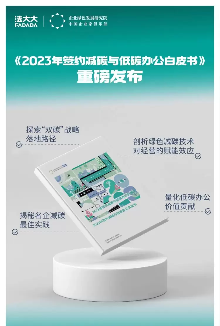 作为业内首部聚焦签约减碳与低碳办公的白皮书,法大大联合企业绿色发展研究院,通过总结全国、各地域、不同行业的签约减碳现状并选取优秀实践案例,全景式呈现签约减碳对企业和用户的赋能效应和带动效应。