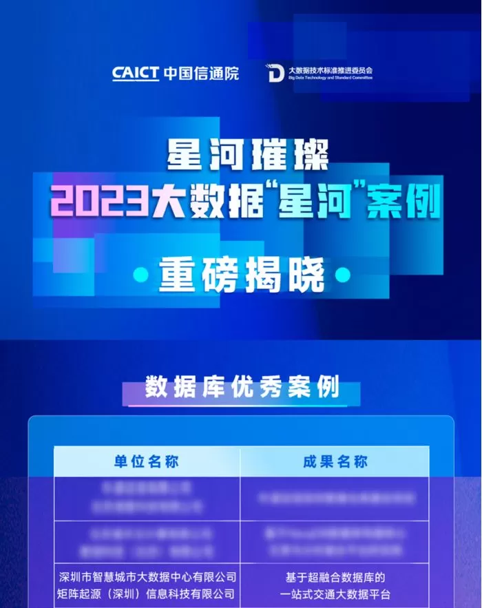 近日,由中国信息通信研究院和中国通信标准化协会大数据技术标准推进委员会(CCSA TC601)共同组织的 2023 大数据“星河(Galaxy)”案例征集活动评选结果现已公示。案例征集自9月启动以来,受到了业界广泛关注和踊跃报名。经过形式审查和专家评审,矩阵起源与深圳智慧城市大数据中心有限公司联合申报的《基于超融合数据库的一站式交通大数据平台》在 706 份申报案例中成功入选数据库优秀案例。