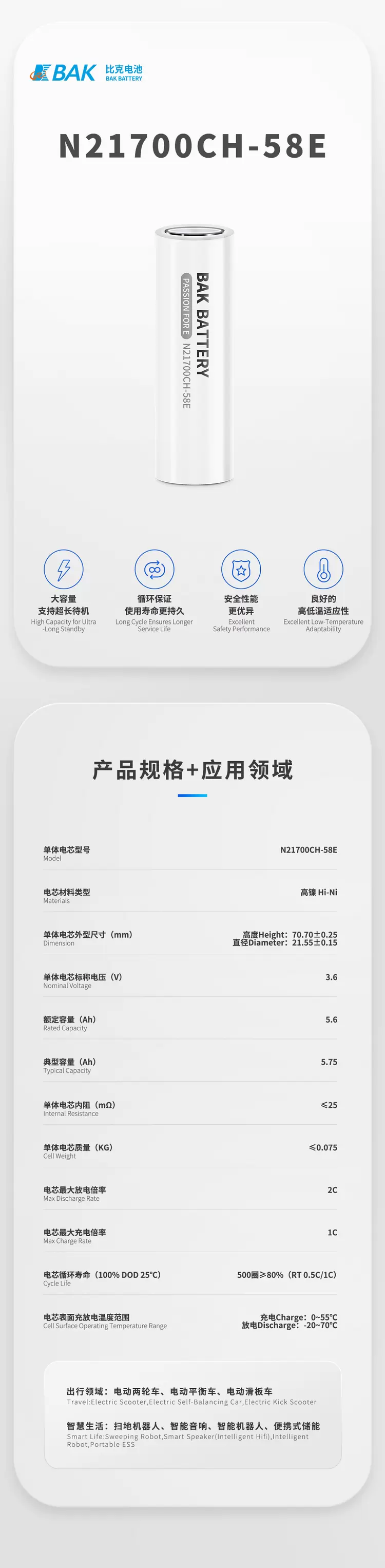 与同系列其他产品相同,比克电池N21700CH-58E电芯采用高镍正极+硅负极体系,可实现-20℃~+70℃的宽温度范围放电,满足极端环境下正常使用需求的同时,经过了过充电、过放电、短路、跌落、加热、震动、挤压等严苛的性能测试,具备高安全可靠性,适用于高容量需求的多应用场景,包括电动两轮车、电动滑板车、电动平衡车等出行领域应用,和扫地机器人、智能音响、智能机器人、便携式储能等智慧生活应用场景。