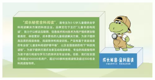 成长秘密全科阅读是一家专注为3-12岁儿童提供全学科阅读解决方案的一家科技型企业。致力于利用互联网、信息技术和AI技术来提升儿童的阅读效率和阅读体验,为广大家庭提供高效而专业的儿童全科阅读解决方案。以“非虚构阅读”为品牌特色,围绕全学科阅读,打造了“成长秘密儿童阅读与学习力测评系统”、成长秘密儿童全科阅读护眼平板、成长秘密科技阅读馆 三大产品矩阵,形成了“阅读能力评估与学习力诊断、线上全科阅读养成、线下专业阅读训练”这样全周期的服务模式。