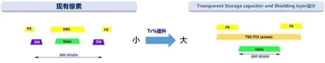 为更好地提升显示表现效果,TSS技术在Data与TSS ITO层之间,设置了间隔较厚的色阻层,可避免Data电容和负载的增加。此外,通过调节TSS ITO与Pixel ITO间绝缘层厚度,可以调整Cst大小,进而避免充电率不足问题。像素充电率的提升,可适应大屏、高分辨率等不断升级的显示趋势。