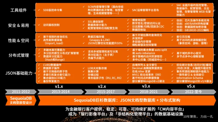 十二年来,巨杉数据库基于JSON文档型数据底座和分布式架构的不断更新与迭代,为企业提供可靠的数据处理和存储解决方案,帮助企业优化业务效率,提升客户满意度。