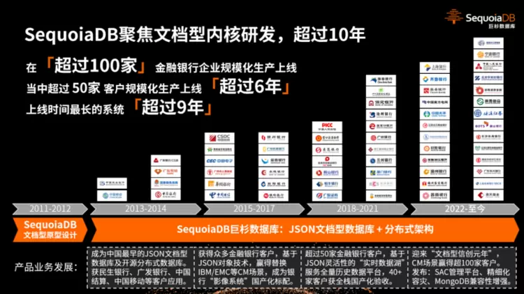 回顾过去,巨杉数据库自2011年研发内核、2012年公司成立,至2013年推出SequoiaDB v1.0版本,再到如今已走过十二个春秋。历经12年的洗礼,巨杉数据库也取得了令人瞩目的成就。目前,巨杉数据库已经在超过100家大型银行及金融机构的核心生产业务规模应用,覆盖各行业的企业用户总数超过1000家。在金融行业,其客户群体涵盖国有银行、股份制银行、省级农信、城商行、保险、证券等金融机构,同时还积极扩展政府、汽车、新能源等多个行业客户,赢得了广泛的市场认可。其中超过50家企业的应用时间已超过6年,最长的系统运行时间甚至达9年。自成立以来,公司实现稳健发展,行业影响力不断提升,数据量及业务接入保持持续增长态势。