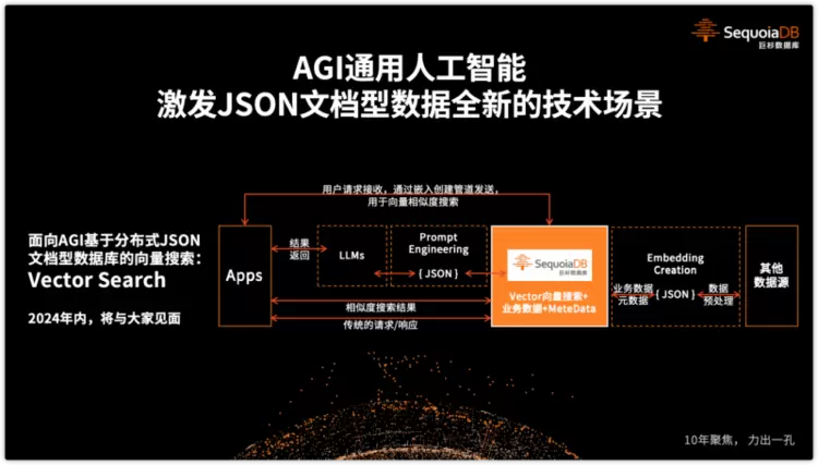 要注意的是,我们并不需要发展独立的向量数据库产品。而是基于深耕了12年的 JSON 文档型数据库底座技术为基础,进行向量查询能力的扩展,这将可以帮助企业,驱动实体世界的更多数据,和 AGI 通用人工智能进行有效链接,释放全量数据价值。