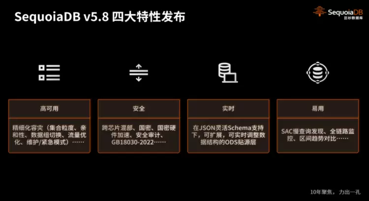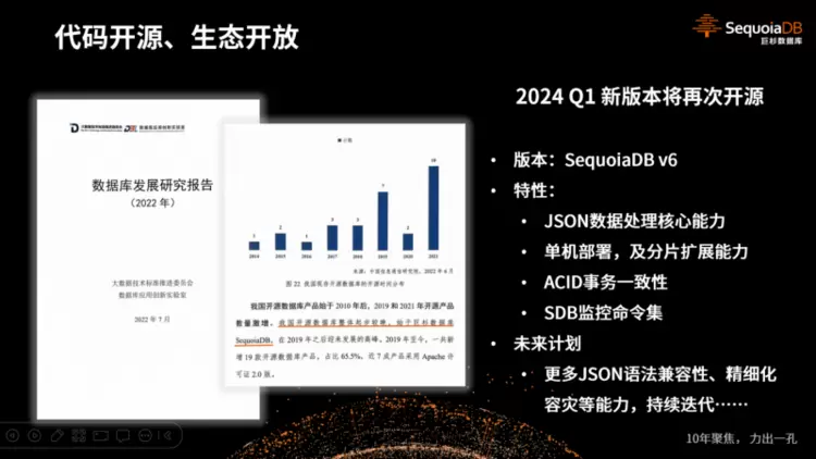 1月15日,巨杉数据库举行SequoiaDB新特性及开源项目发布活动。本次活动回顾了巨杉数据库深耕JSON文档型数据库12年的发展历程与技术演进,全面解读了SequoiaDB包括在高可用、安全、实时、易用性四个方向的技术特性,宣布了2024年面向技术社区的开源计划。此次发布活动不仅是对SequoiaDB性能的全面介绍,更是对十余年来始终坚守以JSON文档型数据库内核为技术底座的发展历程的深刻回顾。不忘来时路,方知向何行,巨杉数据库也将在2024年新年伊始,迎来新的篇章,开启新的征程!