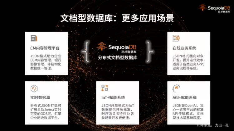 巨杉数据库SequoiaDB以 JSON 文档型数据库内核为技术底座,通过分布式架构为众多客户提供了多元化的业务和全方位的支持。正是因为对技术创新的坚持以及对市场需求的洞察,巨杉数据库始终坚守JSON文档型内核,在持续迭代中实现创新发展。