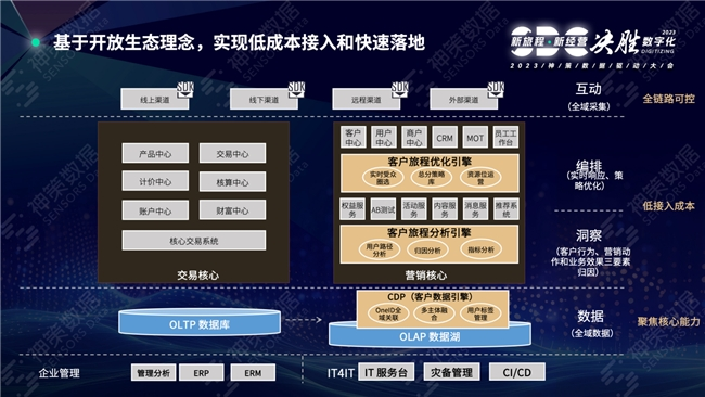 过往金融机构往往围绕交易核心进行it建设。随着近十年移动互联网发展及金融科技能力的提升,在人口红利消失的趋势下,存量博弈愈发激烈。以CJO为代表的营销核心建设开始逐渐被金融机构所重视。神策数据作为软件提供商,分别从互动、数据、洞察、编排四个层面提供三大核心能力,与客户共同促进业务效果的达成。