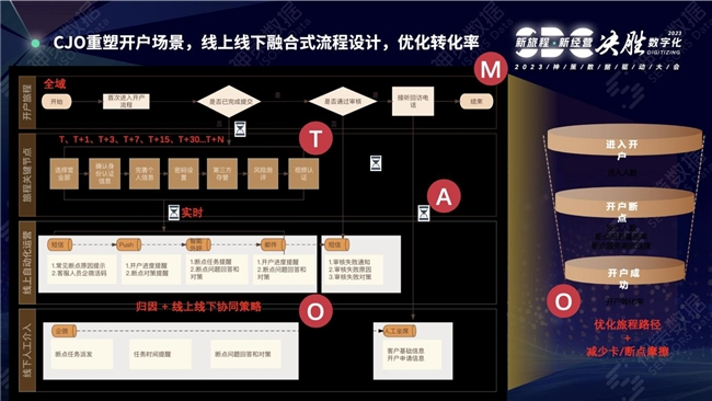 以开户场景为例,其本身是证券行业高度饱和内卷的标准运营内容,但又是所有业务的门槛级必经流程。券商开户流程环节复杂,需要详细 Map 每一个步骤,并针对关键节点,找出高漏损环节进行 Track,对其进行分析,进行线上线下融合式流程设计,优化转化率。以客户为中心,通过可视化旅程管理,提供端到端的个性化服务,准确识别业务流程与客户需求之间的 Gap,发现服务空白,进而定位到业务的二次增长点,实现客户规模持续稳健上升。