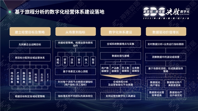 基于神策数据对200+家金融机构的服务及合作经验,我们希望帮助金融机构基于旅程分析建立数字化经营体系。从财富管理经营目标及策略建立到经营场景及具体业务指标,进一步形成数字化体系建设,最终实现数据驱动价值增长的目标。