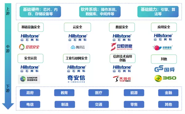 现阶段,我国网络安全行业市场空间已颇具规模,多年来保持了快速增长态势。良好的发展前景及市场机遇也吸引了较多参与者。网络安全产业链上游是涉及网络安全的相关设备/系统,包括芯片、内存等基础硬件;操作系统、数据库、中间件等软件系统,以及引擎、算法等基础能力;中游是网络安全产品和服务厂商,如山石网科等;下游是网络安全产品及服务应用领域,包括政府、教育、医疗、能源、金融、电信、制造等。