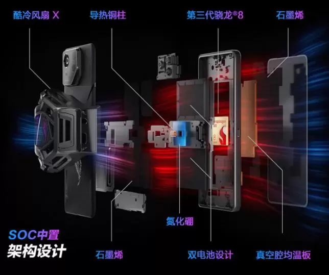 为保证骁龙8 Gen3的性能稳定以及给玩家提供舒适的操作手感,ROG 8系列此次带来了全新的矩阵式液冷散热架构8.0。结构上依旧延续了SoC中置架构,内部则运用了全新的极速传导冷却技术,在SoC与不锈钢板之间专门设计了导热铜柱,直接作用于SoC,能快速将其散发出的热量传导至整个背面,再辅以氮化硼散热材质,散热效率提升20%,有效杜绝积热发生,即使长时间玩高画质游戏,骁龙8 Gen3也不会发生降频,实现时刻满帧畅玩。