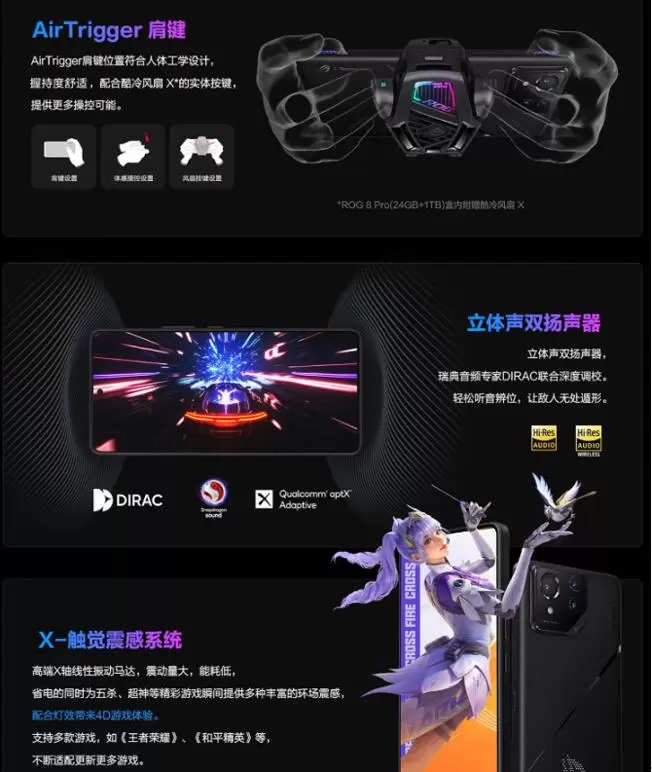 除了强悍的硬件配置,ROG 8系列在体验上也进行了升级。得益于骁龙8 Gen3集成的AI引擎,此次ROG 8系列提供了AI识屏、智能语义搜索、AI语音降噪、AI绘画以及游戏智能提示等功能,让用户畅享AI带来了便利与高效;保持更轻更薄的机身同时,ROG 8系列内置5500mAh大容量电池,支持65W超级快充以及15W无线充电,可助用户疾速补充“能量”,告别续航焦虑;此外,全系还拥有AirTriggers肩键、侧边充电接口、Wi-Fi 7等配置功能,全面满足用户日常使用!