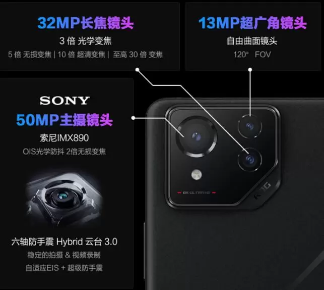 凭借旗舰级影像系统,ROG 8系列能充分满足日常摄影需求。前置3200万像素镜头,后置5000万像素IMX890大底主摄,辅以1300万像素超广角自由曲面镜头,带来更清晰、更细腻的成片效果,助用户轻松拍出惊艳大片。主摄还加入了6轴防手震Hybrid云台3.0,通过云台形式的硬件防抖技术以及自适应EIS、超级防手震算法能有效避免拍摄时因抖动、运动产生的画面模糊、撕裂问题,大大提高视频录制、动态拍照的成片率。