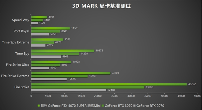 经过以上3DMark测试数据的对比,我们可以清晰地发现,在各项数据上,耕升 GeForce RTX 4070 SUPER 踏雪Mini表现出与GeForce RTX 3070比较大的差异。耕升 GeForce RTX 4070 SUPER 踏雪Mini的性能较比GeForce RTX 2070和GeForce RTX 3070都有较大的提升,部分数据甚至可以拉开一个惊人的差距。例如,在Fire Strike测试中,耕升 GeForce RTX 4070 SUPER 踏雪Mini的得分高达46722分。而在Port Royal测试中,耕升 GeForce RTX 4070 SUPER 踏雪Mini的得分为11501分,与GeForce RTX 3070的8603分和GeForce RTX 2070的5250分存在显著差异。总的来看,基准测试方面的各项数据显示,耕升 GeForce RTX 4070 SUPER 踏雪Mini相比两款显卡的性能提升幅度平均较大,成功拉开了与前代显卡之间的性能差距。