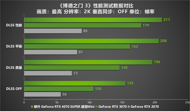 在2K模式下搭载耕升 GeForce RTX 4070 SUPER 踏雪Mini显卡,不开启DLSS游玩这款游戏,平均帧数基本都能维持在155帧以上。在开启DLSS 性能模式下,甚至突破200帧的大关,达到恐怖的平均211帧。与另外两张显卡相比有着大概40帧到100帧的差距。