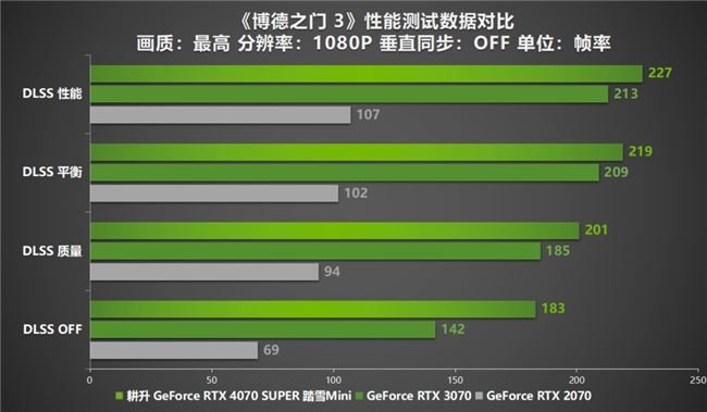 由于该游戏并没有自带基准测试,这里实录一段相同场景下的帧率表现为大家展示帧数详情。在启用NVIDIA DLSS 2技术后,可以惊喜地发现耕升 GeForce RTX 4070 SUPER 踏雪Mini的表现相当出色。哪怕没有开启DLSS,游戏也能到达到平均183帧的超高水准,和前代显卡相比有着平均40帧的差距。开启DLSS后,在质量模式下,游戏能够达到平均201帧的流畅水准。而在性能模式下,游戏更是达到惊人的227帧。通过耕升 GeForce RTX 4070 SUPER 踏雪Mini的协助,该游戏迎来巨大的提升,用户们必将获得卓越的游戏体验。