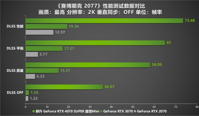 而在2K分辨率下的最高画质,耕升 GeForce RTX 4070 SUPER 踏雪Mini在未开启DLSS时也只能达到平均36.01帧,可见《赛博朋克2077》这款3A大作对配置的要求还是很高的。在开启DLSS 3.5技术后,帧数明显提高,在开启DLSS 平衡模式下,就已经来到平均65帧,可以流畅游玩游戏。特别是在开启DLSS性能后,能够到达平均73.48帧,帧数更进一步。另外两款显卡则在开启DLSS 2的情况下,也无法在2K分辨率中正常游玩,只有最高平均19.36帧和12.97帧。