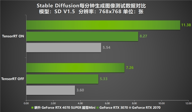 接下来是生成768x768的图像,在不开启TensorRT加速的情况下耕升 GeForce RTX 4070 SUPER 踏雪Mini每分钟可以生成图像7.26张。两张前代显卡与之相比也有着较大的差距。当开启TensorRT加速后,生成速度则达到了每分钟11.38张,突破两位数,让各位用户的体验得到了质的提升。