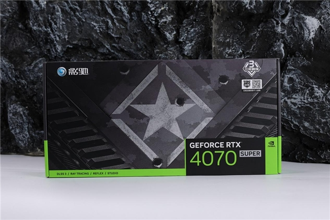 包装上,影驰RTX 4070 SUPER 大将的包装外盒以将系列经典的黑灰色调打底,中间赫然的枪洞五角星图案彰显军工硬朗气质,整体设计低调内敛,包装盒正面右上角,还标有三年质保和个人送保的图案与二维码。