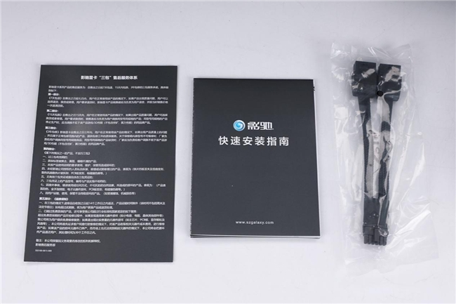 掀开包装盒盖,盒子内除了显卡本体外,还有一份保修卡、安装指南和一根12VHPWR转2*8pin供电线。
