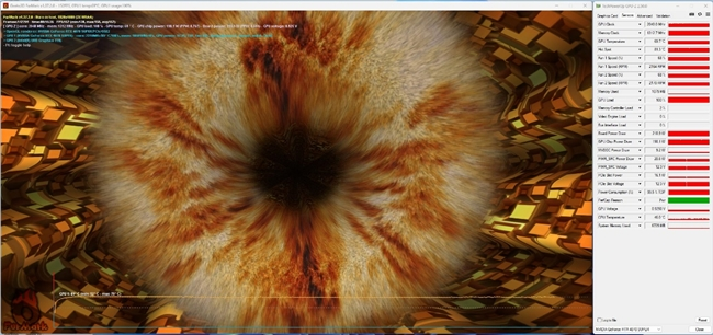 Furmark压力测试中,在散热风道良好的机箱环境里,显卡进行了15分钟的烤机测试,实测结果如图所示,温度最高69.7℃,频率达到2040MHz,功耗则在220W左右浮动。