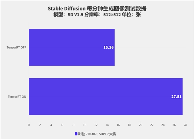 在Stable Diffusion 软件中,在不开启TensorRT加速时,影驰RTX 4070 SUPER 大将每分钟可生成512*512图像15.36张。开启TensorRT加速后,生成速度大幅提高,达到每分钟生成27.51张,开启前后近乎一倍的生成效率,证实了影驰RTX 4070 SUPER 大将能极大提升用户的使用体验。