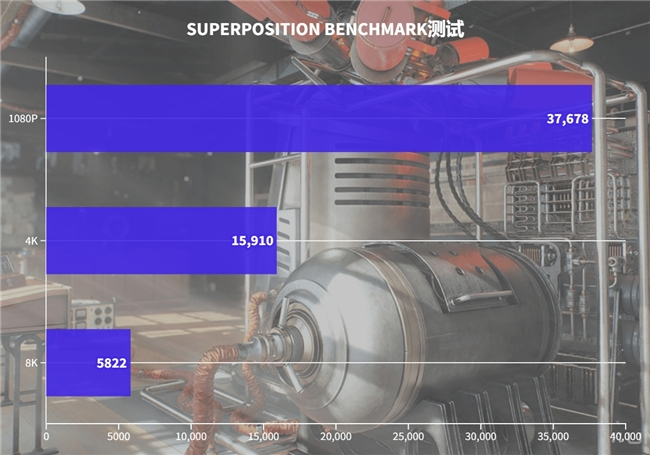 SuperpositionBenchmark测试中,1080P设置下为37678分,4K设置下为15910分,8K设置下为5822分。