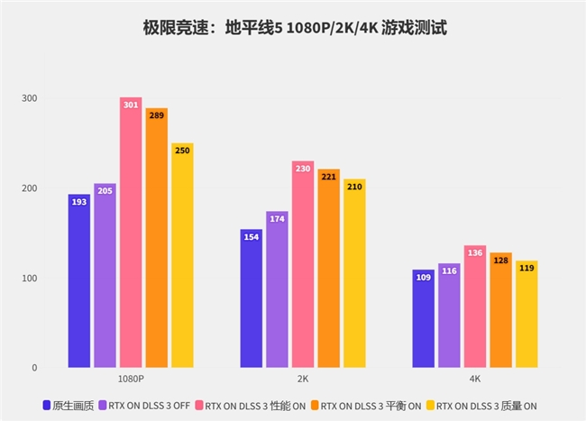 在1080P分辨率下,进行《极限竞速:地平线5》的测试,将预设开至最高,在不开RTX和DLSS的情况下,1080P、2K、4K的平均帧数分别达到了193帧、154帧和109帧。在分别开启DLSS 3的三个模式(性能、平衡、质量)后,1080P在性能模式下达到301帧,2K分辨率下则均能突破200帧大关,而在4K分辨率的DLSS 3的质量模式下,游戏也能轻松达到119帧,印证了影驰RTX 4070 SUPER 大将在各分辨率下都能游刃有余。