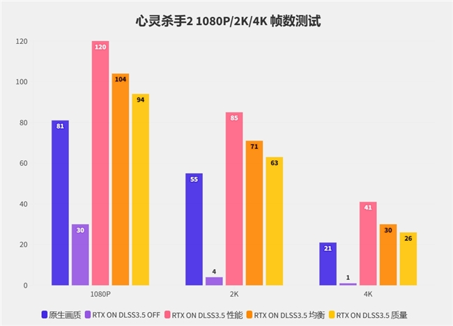 而在打开光线追踪技术后,画面精美的同时游戏帧数却显著下降,但伴随着DLSS 3.5的开启,游戏帧数又一次表现出惊人的提升。1080P的DLSS性能模式下,游戏达到了超流畅的120帧,2K分辨率达到85帧,原生画质到光追画质效果之间得到了将近67%的帧数提升。4K分辨率也不再疲软,以41帧的流畅表现岿然屹立着。
