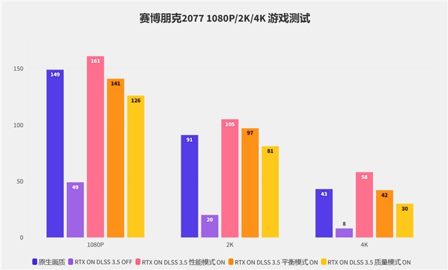 游戏方面,作为首批支持NVIDIA DLSS 3.5的游戏《赛博朋克2077》,自然是衡量影驰 RTX 4070 SUPER 大将实际游戏性能的不二平台。在1080P原生画质(不开启DLSS3.5和RTX)下,能达到平均149帧的优秀表现,流畅游玩不在话下,但由于缺乏光线追踪,视觉效果较为平庸。而当开启RTX光线追踪后,游戏也仍能稳定保持在49帧左右,当开启DLSS 3.5技术后,帧数呈爆发性上涨,分别达到性能模式下的161帧、平衡模式下的141帧和质量模式下的126帧。