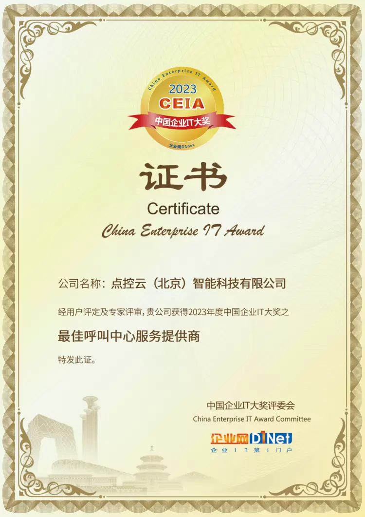 2024年1月15日,由政企市场专业媒体企业网D1Net、信众智(CIO智力输出及共享平台)和中国企业数字化联盟共同举办的“2023 CEIA中国企业IT大奖”重磅揭晓。点控云获评2023 CEIA中国企业IT大奖之年度“最佳呼叫中心服务提供商”奖。