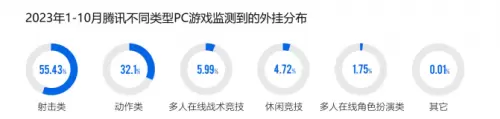 在端游外挂样本中,射击类游戏的外挂数超过半数,从往年的50.5%增加到55.43%,其次为动作角色扮演类游戏,占总体PC游戏外挂数的32.1%。