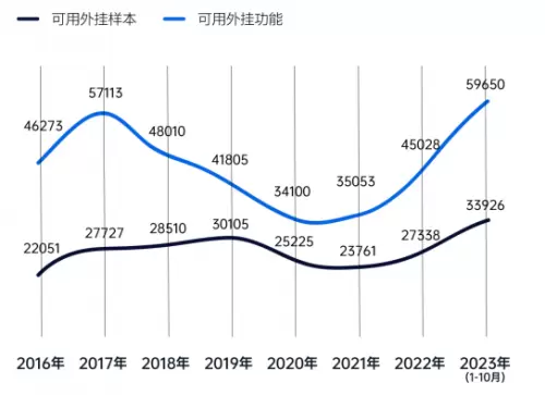 2023年1-10月,腾讯PC游戏外挂保持着高位激烈对抗态势,外挂样本数量按月均值达到3393款同比2022年月均值2278款增长49%。而外挂功能数按月均值更是达到了5965款,同比2022年月均3752款增长59%。