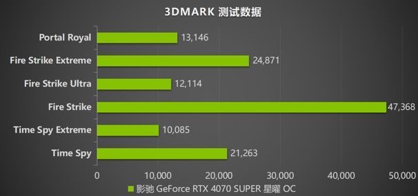 在3DMark TimeSpy DX12 测试中,影驰 GeForce RTX 4070 SUPER 星曜 OC 的表现也是称得上优异的。显卡分数达到了21263分。在3DMark Fire Strike DX11测试中,影驰 GeForce RTX 4070 SUPER 星曜 OC的显卡分数为47368的高分。其性能足以让玩家流畅运行市面上的大多数游戏,实现高刷新率的需求。看到光追表现测试中,3DMark Portal Royal光追测试的分数达到了13146的成绩。该分数表明,影驰 GeForce RTX 4070 SUPER 星曜 OC 在运行3A光追游戏大作时的性能体现,可以说是优良。
