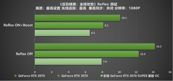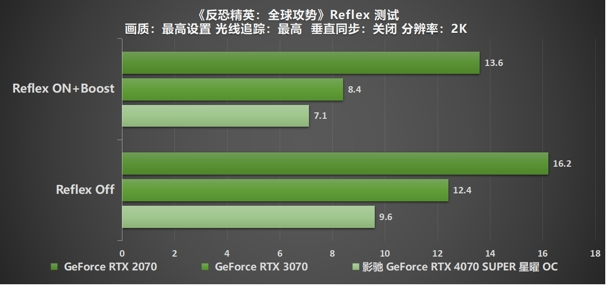 《反恐精英:全球攻势》作为一款风靡全球的多人射击游戏,在游戏引擎、游戏物理、游戏系统和游戏模式等方面都将有所改进和提升,将为用户带来更加优质的游戏体验。而对于射击游戏而言,系统延迟绝对是用户们的一生之敌。在高强度的射击比赛中,这小小的延迟差距将可能决定整场游戏的胜负。而NVIDIA Reflex的加持则是能从根本上降低。借助 NVIDIA Reflex,影驰 GeForce RTX 4070 SUPER 星曜 OC在1080P下的结果可以达到6.5ms,而在2K分辨率下也依旧可以达到7.1ms。