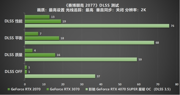 而在2K环境下,《赛博朋克 2077》对于硬件的要求明显在高一层,GeForce RTX 3070与GeForce RTX 2070可以说是彻底无法游玩这款游戏了。再来看看影驰 GeForce RTX 4070 SUPER 星曜 OC 的表现。在自身性能加持下,该卡可以达到37帧。开启DLSS 3.5模式后,分别拥有不同程度的性能提升。其中在DLSS 性能模式下,帧数上涨了105.5%,达到了76帧。