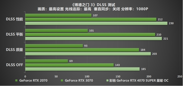 在游戏测试部分,将为用户们提供直观的影驰 GeForce RTX 4070 SUPER 星曜 OC 具体性能表现数据。以及NVIDIA DLSS 2与NVIDIA DLSS 3/3.5之间的差距。按照惯例,测试的游戏选择了对于硬件拥有着严格要求的热门光追游戏大作,分别是《博德之门3》、《漫威蜘蛛侠: 重制版》和《赛博朋克 2077》, 画面分辨率选择1080P和2K,均一致开启最高画质以及光线追踪技术。游戏实测将采用影驰 GeForce RTX 4070 SUPER 星曜 OC、GeForce RTX 3070 和GeForce RTX 2070三张显卡,前者采用 NVIDIA DLSS 3/3.5 技术,后两者均采用NVIDIA DLSS 2 技术。