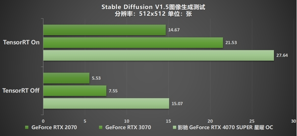 通过数据可以得到,凭借显卡自身性能加持的情况下,影驰 GeForce RTX 4070 SUPER 星曜 OC每分钟可生成15.37 张图像,而GeForce RTX 3070 每分钟则能生成7.55张,GeForce RTX 2070仅仅能生成5.53张 512x512规格的图像。对比数据,影驰 GeForce RTX 4070 SUPER 星曜 OC 的生成速度比其余两者高2~3倍左右。而通过TensorRT 进行加速后,影驰 GeForce RTX 4070 SUPER 星曜 OC 每分钟可生产的12x512规格图像则高达27.64张。足以见证该卡强悍的生产能力。