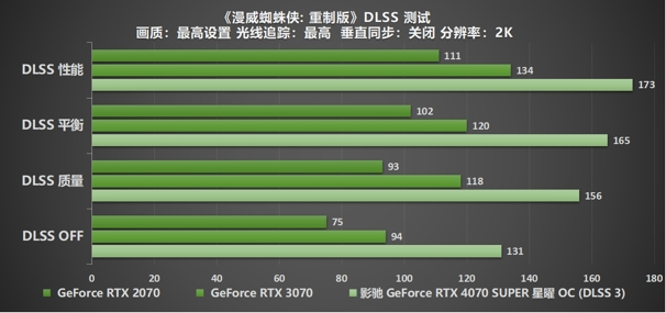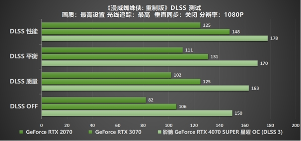 在均不开启DLSS 技术加持下,影驰 GeForce RTX 4070 SUPER 星曜 OC 的性能表现明显高于另外两张显卡。该卡在1080P下帧数能高达150帧。在DLSS 3模式下也是分别达到了 163帧、170帧和178帧 的成绩。通过NVIDIA DLSS 技术的加持,其中最早推出的 GeForce RTX 2070 在《漫威蜘蛛侠: 重制版》中最高分也能达到过百帧的成绩。