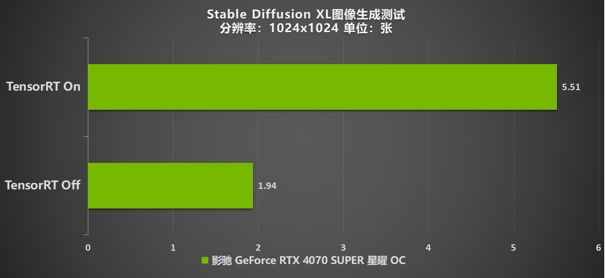 对于768x768规格的图像生成而言, 影驰 GeForce RTX 4070 SUPER 星曜 OC 的生产力可以达到每分钟生成7.76张,反之GeForce RTX 2070每分钟仅能达到3.83张。开启TensorRT 加速后,影驰 GeForce RTX 4070 SUPER 星曜 OC 的生成速度也是突破了每分钟10张往上的成绩,达到了每分钟11.38张。