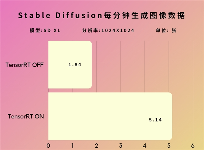 在不开启TensorRT时,影驰GeForce RTX 4070 SUPER星曜OC每分钟生成512*512图像为16.31张。而开启TensorRT后,图像生成速度飙升,达到每分钟生成27.51张,开启前后生成效率相差接近一倍。