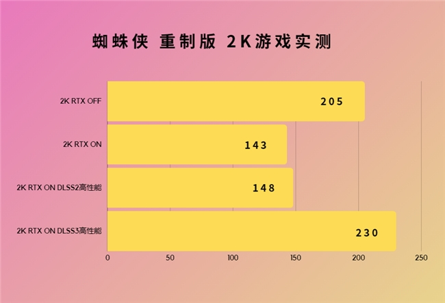 第二款游戏选择了《漫威蜘蛛侠1》;将预设开至非常高,在2K分辨率下,在不开RTX和DLSS的情况下,平均帧数就已经达到了205帧,而在开启DLSS3高性能与DLSS 3帧生成技术以后,帧数分别来到了148帧以及230帧。